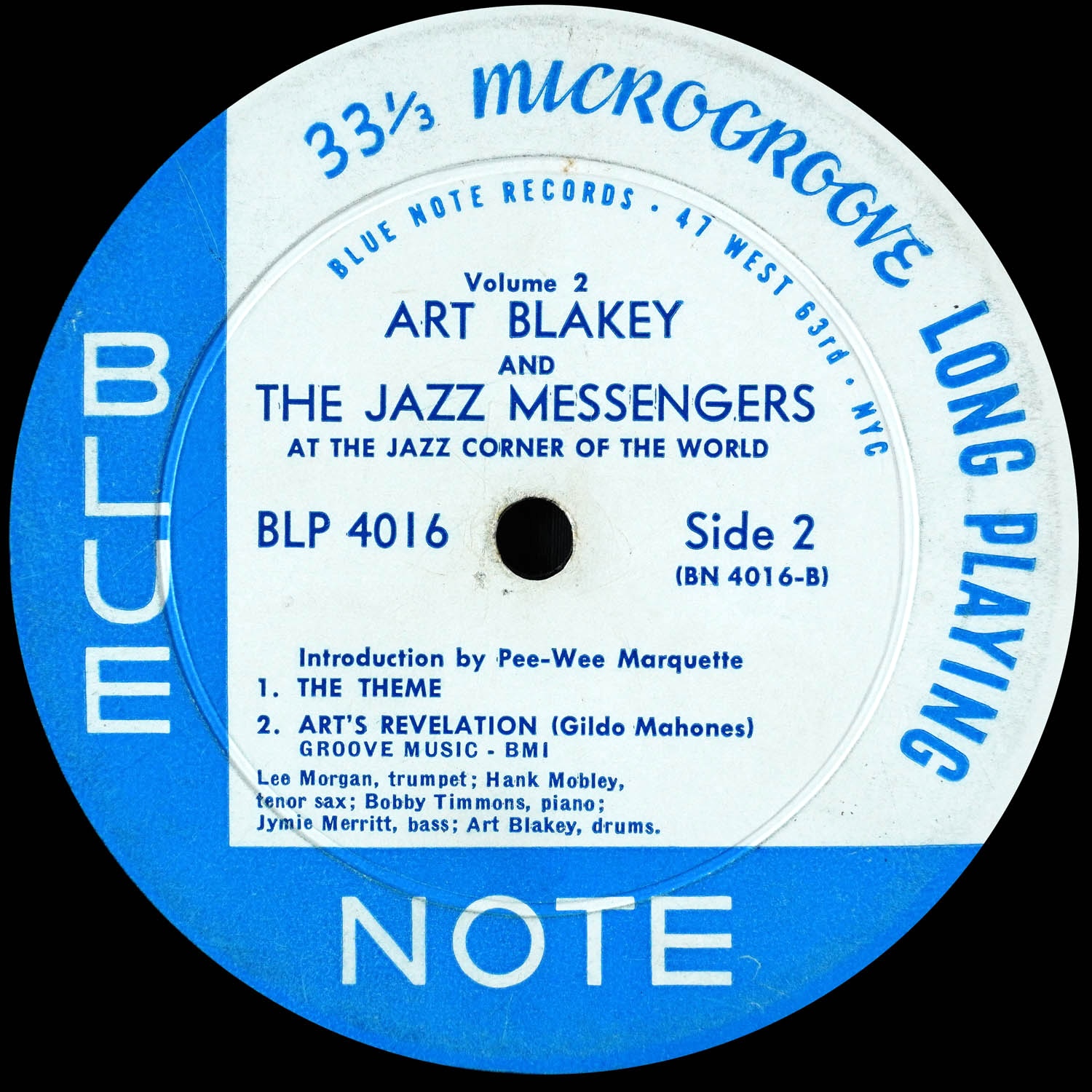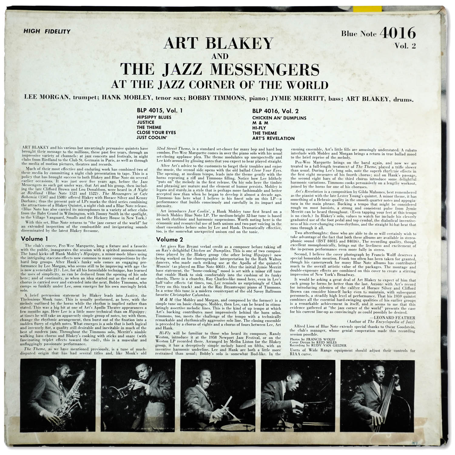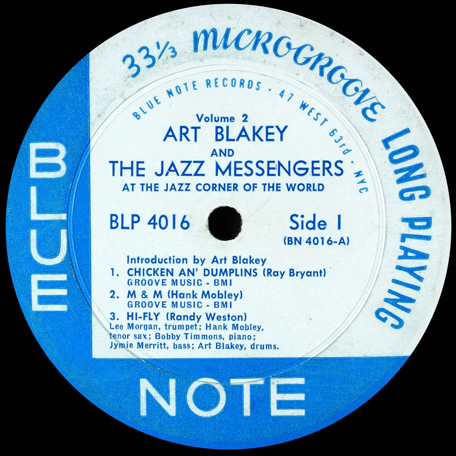 Art Blakey & the Jazz Messengers at the Jazz Corner of the World, Vol. 2 (Blue Note 4016) Collection Favorites > Original 1960 mono pressing Deep groove both sides Plastylite “P” etched and “RVG” stamped in dead wax” Recorded April 15, 1959 at Birdland NYC 1 Chicken an’ Dumplins 2 M & M 3 Hi-Fly 4 The Theme 5 Art’s Revelation Selection: “Hi-Fly” (Weston) https://dgmono.com/wp-content/uploads/2026/03/BLP-4016-Hi-Fly.mp3