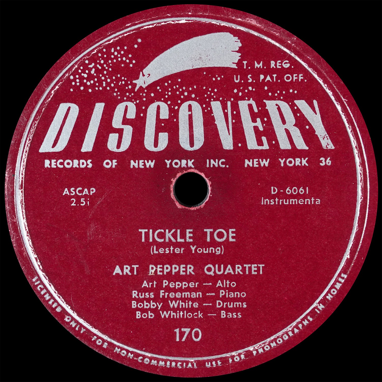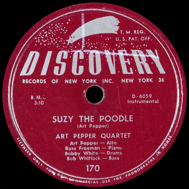 Art Pepper Quartet, “Suzy the Poodle” / “Tickle Toe” (Discovery 170) Collection Favorites > Original pressing Recorded March 29, 1953 at Radio Recorders, Los Angeles A Suzy the Poodle B Tickle Toe Selections: “Suzy the Poodle” (Pepper) https://dgmono.com/wp-content/uploads/2025/11/Discovery-Suzy-the-Poodle.mp3 “Tickle Toe” (Young) https://dgmono.com/wp-content/uploads/2025/11/Discovery-Tickle-Toe.mp3