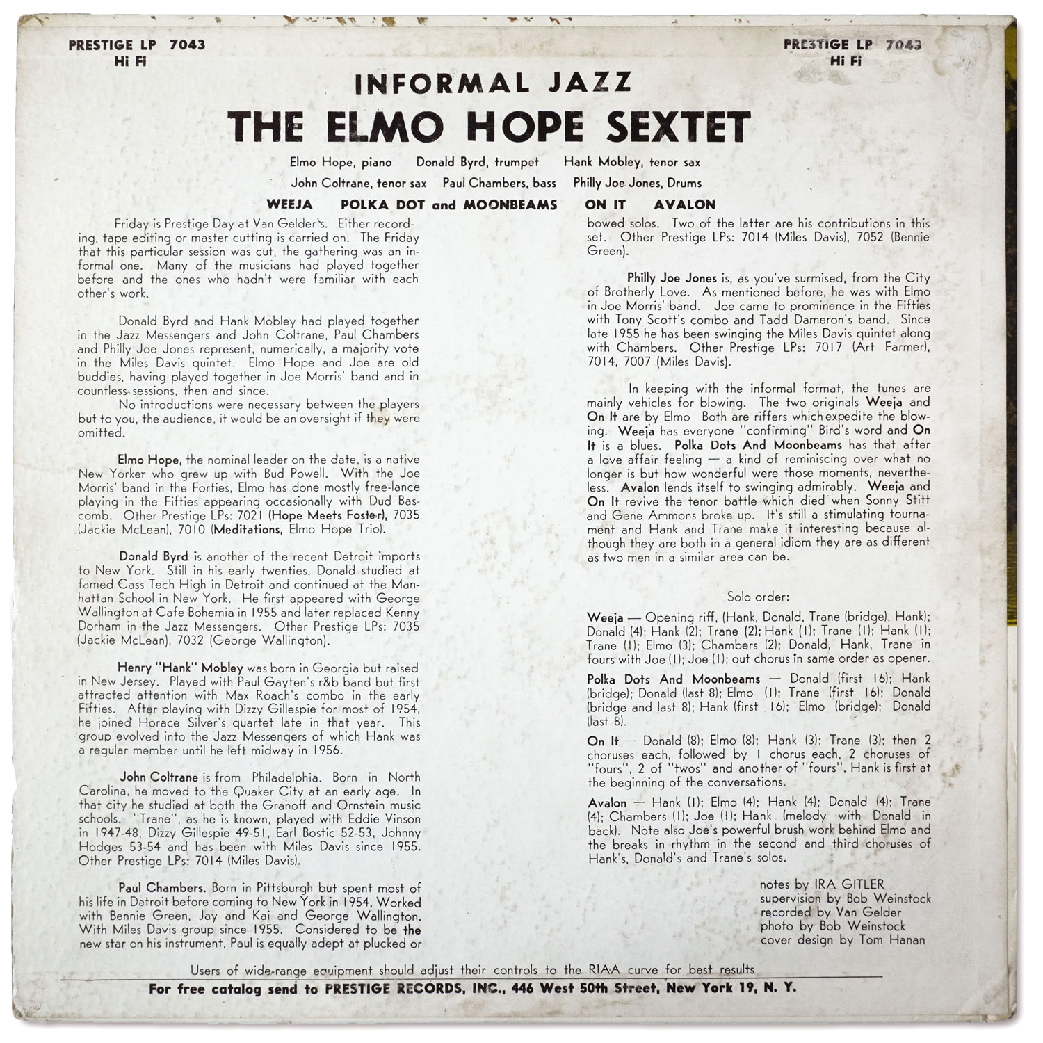 Elmo Hope Sextet, Informal Jazz (Prestige 7043) Collection Favorites > Original 1956 pressing (mono) “RVG” etched in dead wax Recorded May 7, 1956 at Van Gelder Studio, Hackensack, New Jersey 1 Weeja 2 Polka Dots and Moonbeams 3 On It 4 Avalon Selection: “Avalon” (Jolson-DeSilva-Rose) https://dgmono.com/wp-content/uploads/2026/03/PRLP-7043-Avalon.mp3