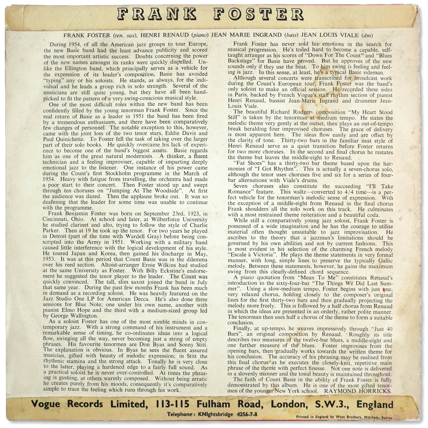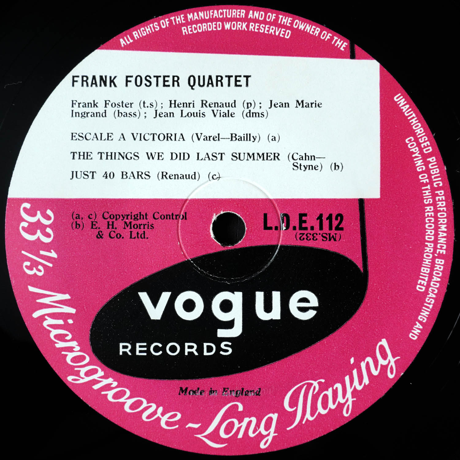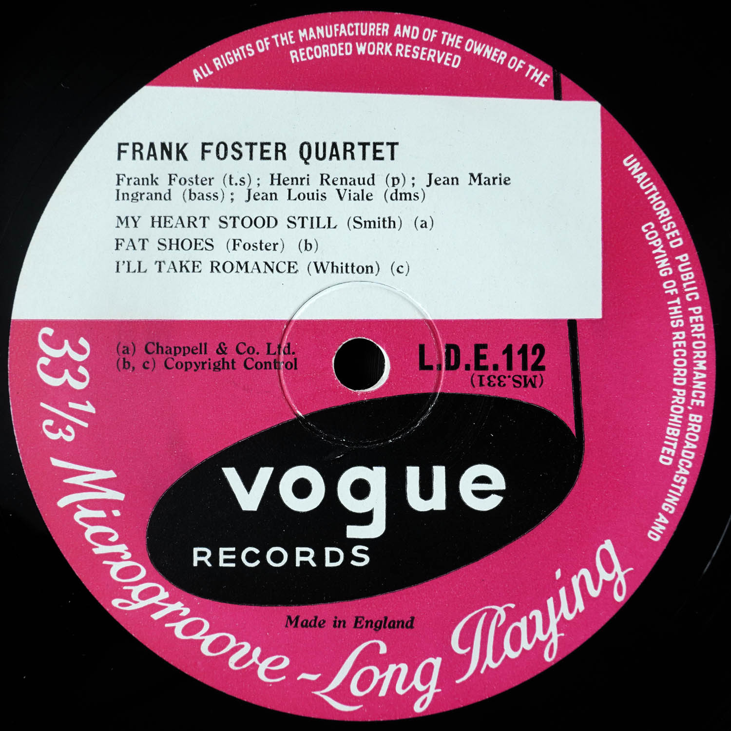 Frank Foster Quartet (Vogue 112) Collection Favorites > Original 10 inch UK pressing Recorded 1954 in Paris 1 My Heart Stood Still 2 Fat Shoes 3 I’ll Take Romance 4 Escale a Victoria 5 The Things We Did Last Summer 6 Just Forty Bars Selection: “Fat Shoes” (Foster) https://dgmono.com/wp-content/uploads/2026/03/Vogue-LDE-112-Fat-Shoes.mp3