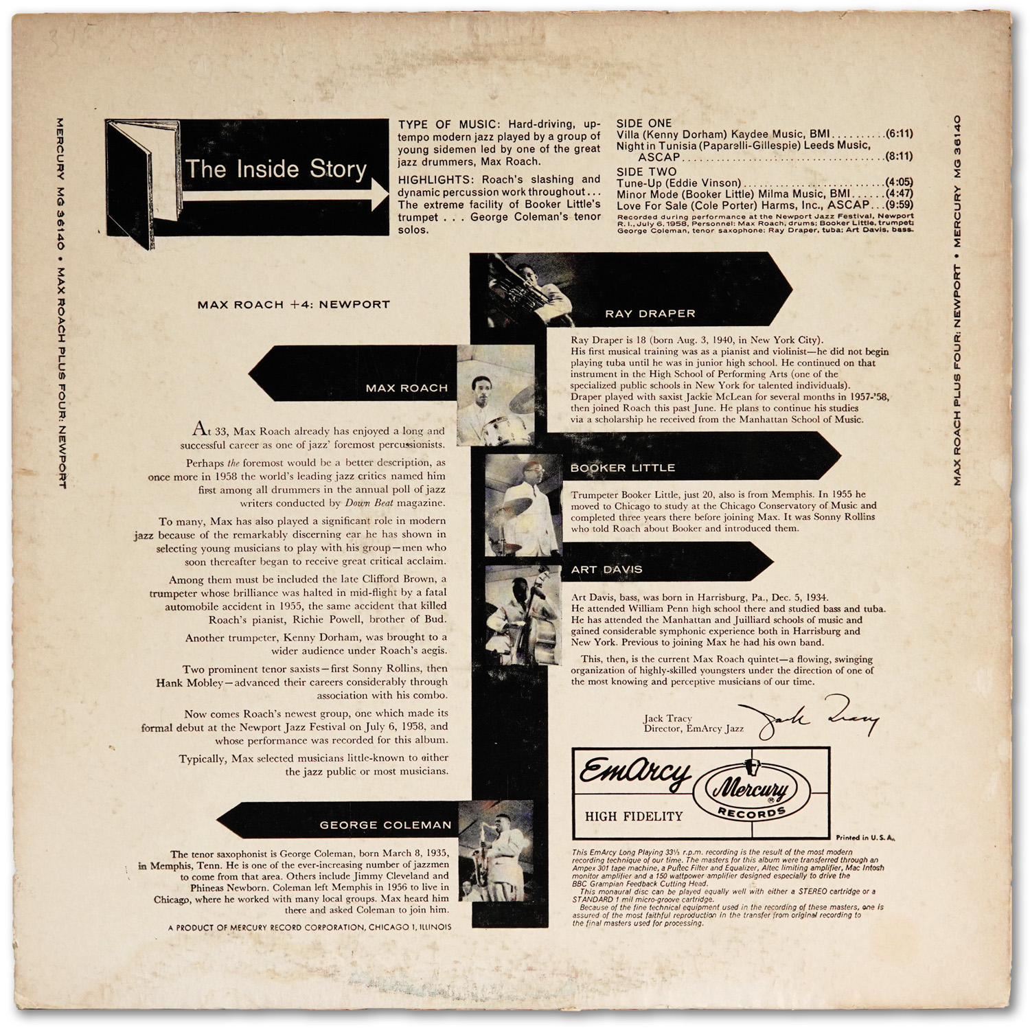Max Roach Plus Four at Newport (EmArcy 36140) Original 1958 mono pressing Recorded July 6, 1958 at the Newport Jazz Festival, Newport, Rhode Island 1 Villa 2 A Night in Tunisia 3 Tune-Up 4 Minor Mode 5 Love for Sale Selections: “Villa” (Dorham) https://dgmono.com/wp-content/uploads/2023/09/Max-Roach-Newport-Villa.mp3 “Tune Up” (Vinson) https://dgmono.com/wp-content/uploads/2023/09/Max-Roach-Newport-Tune-Up.mp3 “Love for Sale” (Porter) https://dgmono.com/wp-content/uploads/2023/09/Max-Roach-Newport-Love-for-Sale.mp3