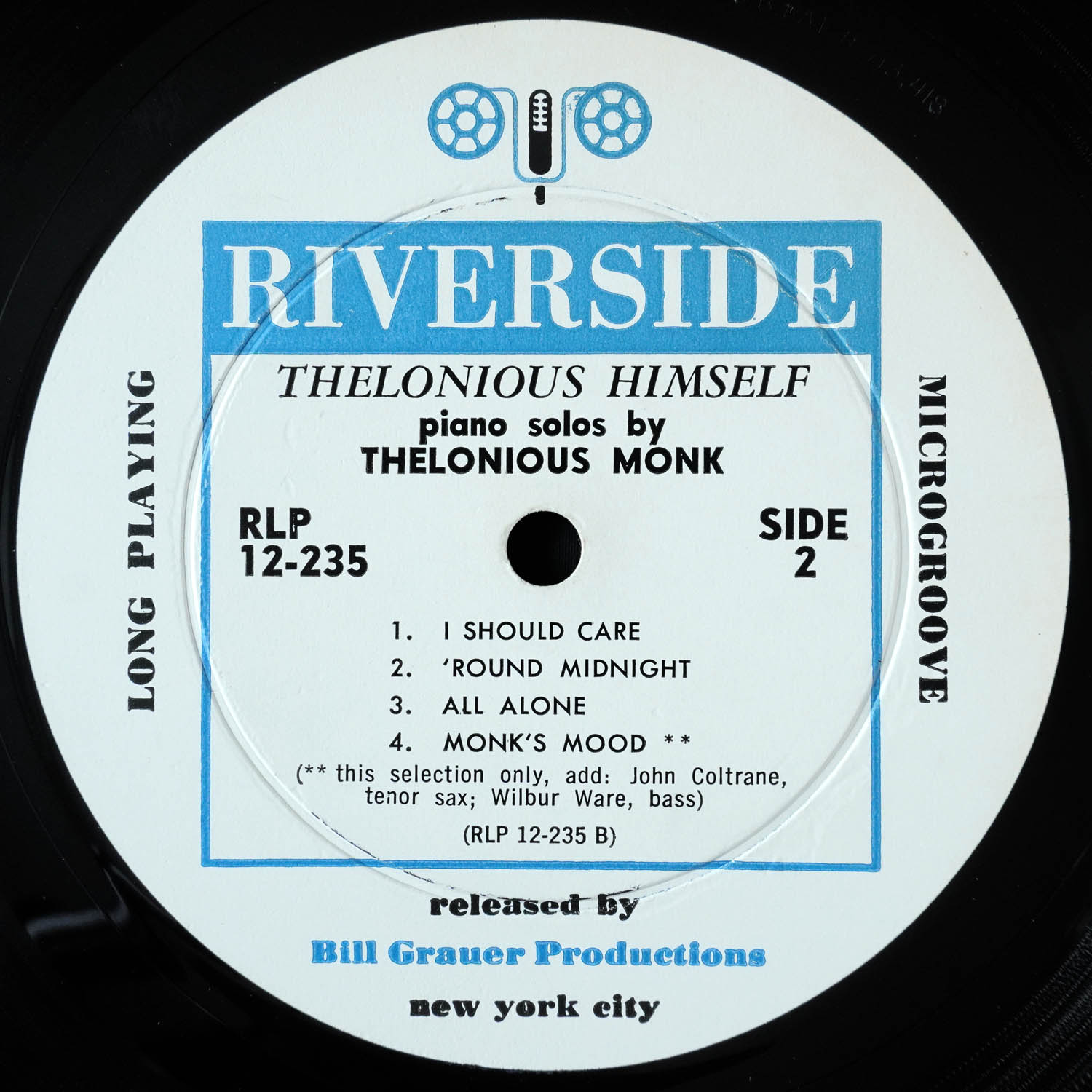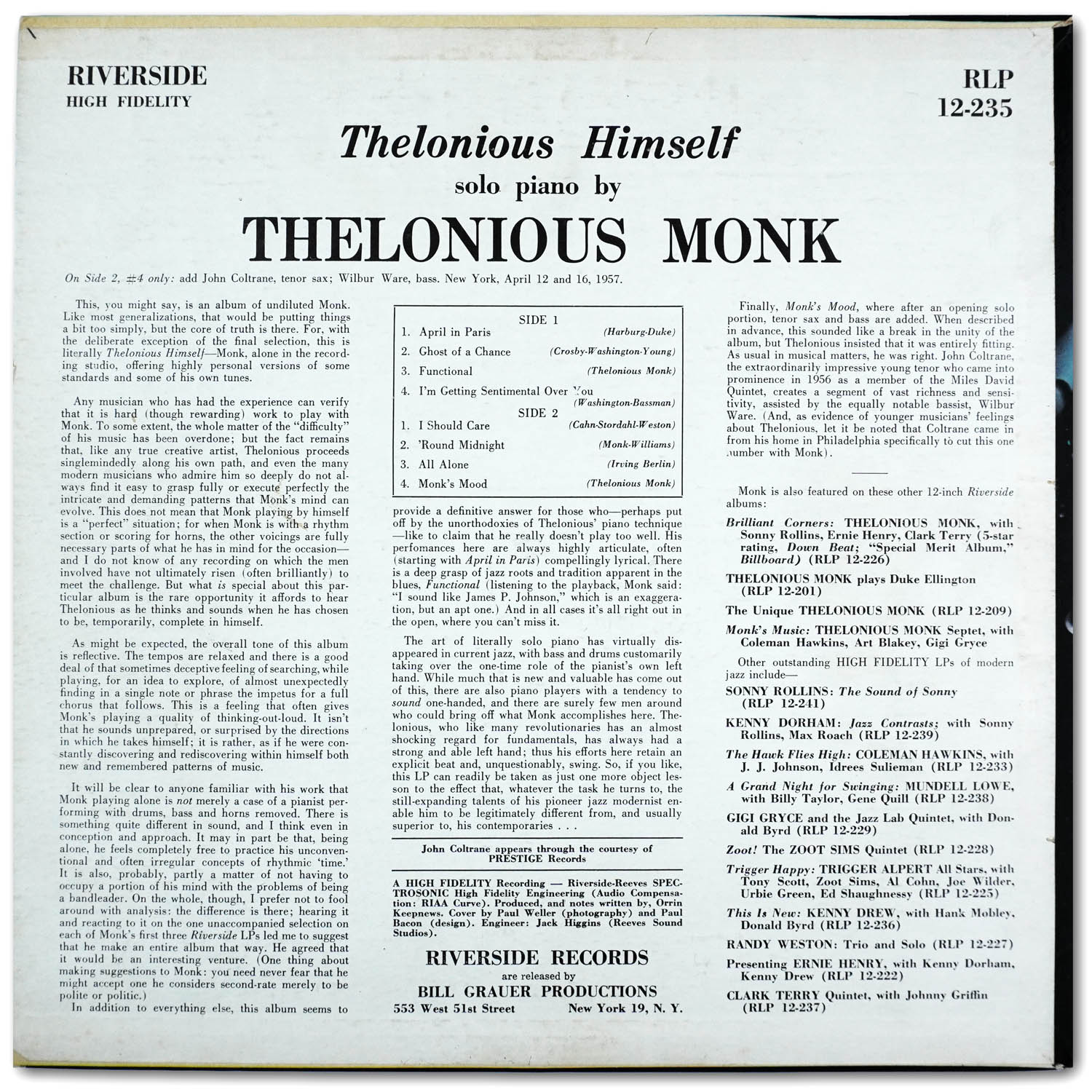 Note: “Monk’s Mood” and “All Alone” erroneously listed backwards on jacket and label